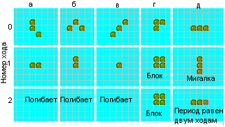 Конфигурация г на втором ходу превращается в устойчивую конфигурацию — "блок" (квадрат размером 2Х2). Конфигурация д служит простейшим примером так называемых "флип-флопов" (кувыркающихся конфигураций, возвращающихся в исходное состояние через каждые два хода). При этом она попеременно превращается то в вертикальный, то в горизонтальный ряд из трех фишек. Конуэй называет этот триплет "мигалкой".