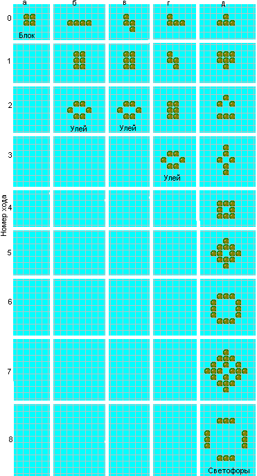 На рис. 2 изображена эволюция пяти тетрамино (четыре клетки, из которых состоит элемент тетрамино, связаны между собой ходом ладьи). Как мы уже видели, квадрат а относится к категории "любителей спокойной жизни". Конфигурации б и в после второго хода превращаются в устойчивую конфигурацию, называемую "ульем". Отметим попутно, что "ульи" возникают в процессе игры довольно часто. Тетрамино, обозначенное буквой г, также превращается в улей, но на третьем ходу. Особый интерес представляет тетрамино д, которое после девятого хода распадается на четыре отдельные "мигалки", Вся конфигурация носит название "навигационные огни", или "светофоры". "Светофоры" относятся к разряду флип-флопов и возникают в игре довольно часто.