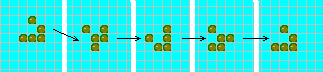 Важно понять, что гибель и рождение всех "организмов" происходят одновременно. Вместе взятые, они образуют одно поколение или, как мы будем говорить, один "ход" в эволюции начальной конфигурации. Ходы Конуэй рекомендует делать следующим образом:
